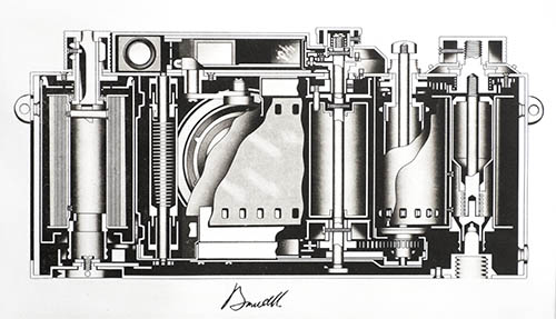 Etching of vintage Leica cross section view This is a fine art illustration, a cross section of a Leica II. It is an original etching created and printed by me. It is not an inkjet or giclee, nor an offset reproduction of any kind. |